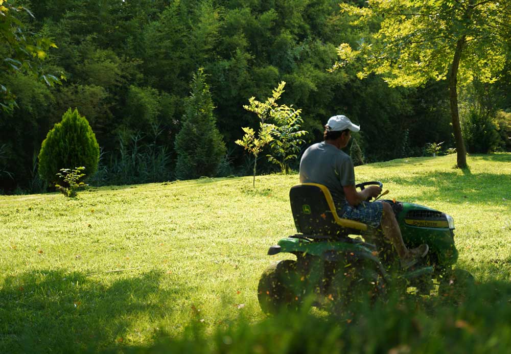 Exemples de prestations de services à la personne : Tonte et scarification de pelouse, entretien des massifs, taille des arbres, des arbustes et des haies, ..